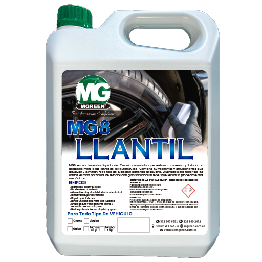 Es un limpiador líquido de fórmula avanzada que restaura, conserva y brinda un acabado mate a las llantas de los automóviles. Contiene humectantes y emulsionantes que disuelven y eliminan todo tipo de suciedad adherida al caucho.